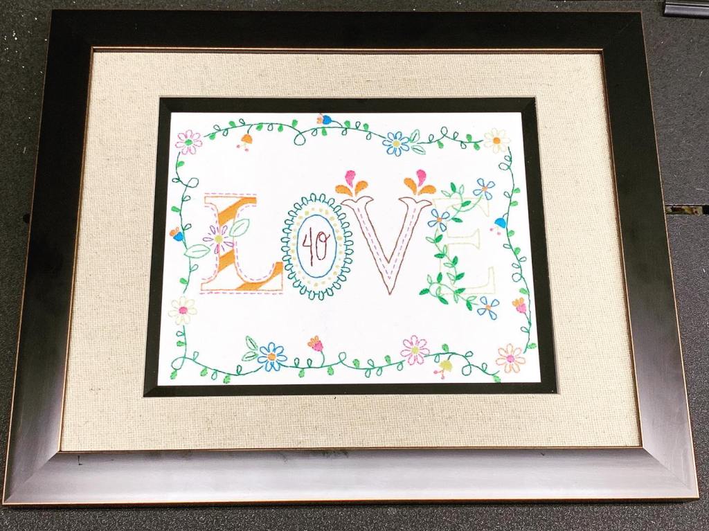 This was such a fun piece to work on, and it makes me so happy to see it hanging in their home! Stamped embroidery kits are really fun, fast, and rewarding in general. I added the 40 in the middle of the O to commemorate the occasion. I love a little personalized touch!