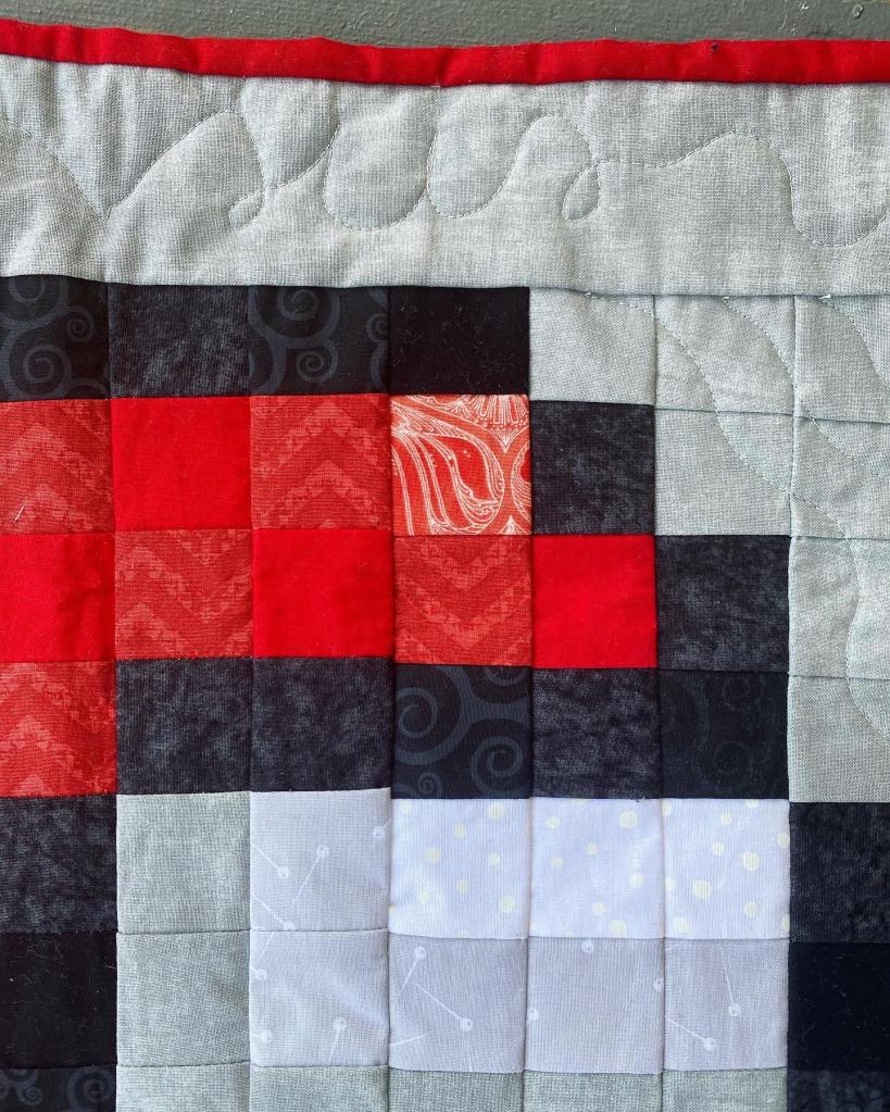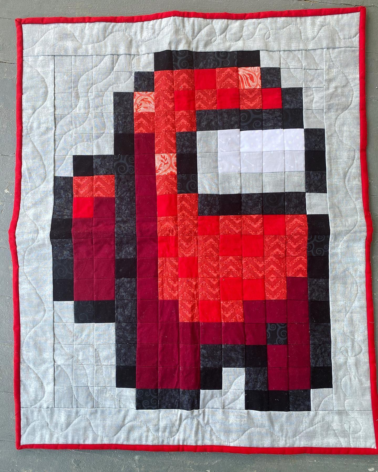 I created this Among Us wall hanging using fusible grid and scraps. It s 24″ x 30″. I gave it away on stream when I hit the donation goal for my new sewing table!